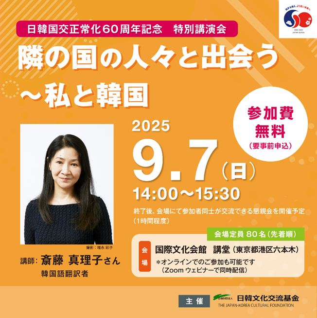 나아가 2018년 한국 대표 페미니즘 작품으로 손꼽히는 조남주 작가의 『82년생 김지영(82年生まれ, キム・ジヨン)』을 번역했다. 2025년에는 노벨문학상을 수상하며 전 세계에 한국 문학의 매력을 알린 한강 작가의 『작별하지 않는다(別れを告げない)』를 번역하며 제76회 요미우리 문학상(연구, 번역 부문)을 수상했다. 사이토우 씨는 번역가 활동뿐만 아니라 작가로도 왕성한 활동을 펼치고 있다. 『韓国文学の中心にあるもの(한국 문학의 중심에 있는 것들)』을 비롯해 이번 강연회의 주제인 『隣の国の人々と出会う-韓国語と日本語とのあいだ(이웃 나라의 사람들과 만나다-한국어와 일본어의 사이에서)』 등의 도서도 출간했다. 일본 내 한국 문학의 열풍을 이끌어낸 중심인물이기에 한일 국교정상화 60주년을 기념하는 특별 강연회의 강연자로 오른 것으로 예상된다.