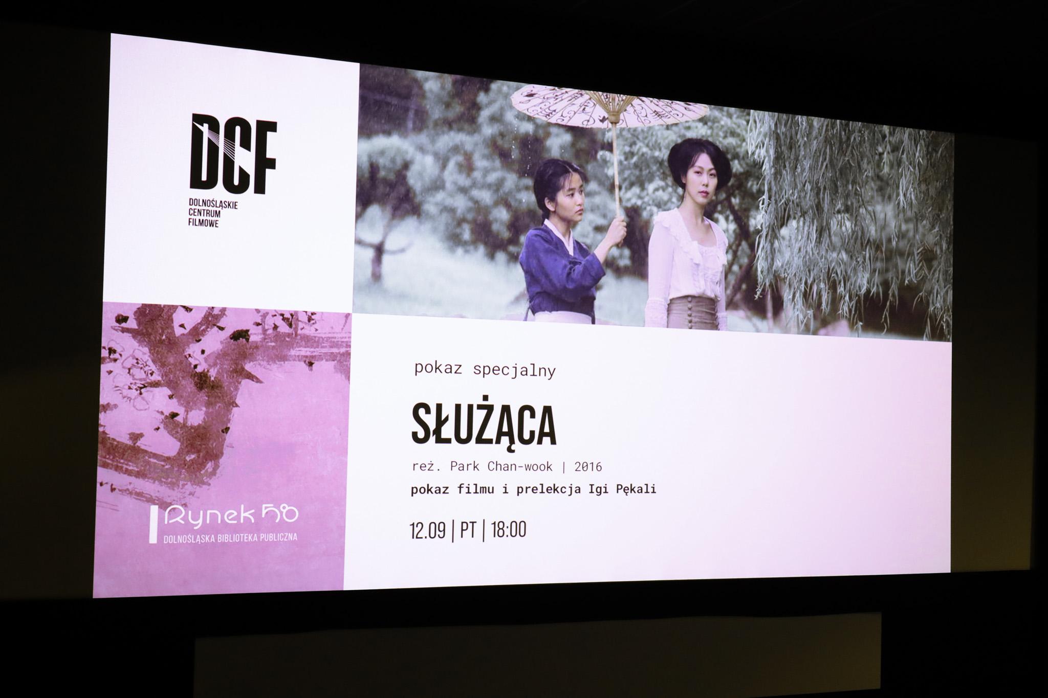 두 번째 행사는 한국 영화계의 거장 박찬욱 감독의 작품 <아가씨> 상영회였다. 이 행사는 돌노슐롱스키에 영화 센터(Dolnośląskie Centrum Filmowe, DCF)와 협력해 2025년 9월 12일 금요일 18시 랄카 상영관에서 열렸다. 이날 상영회는 단순한 영화 감상회가 아니라 이가 페칼라 박사의 해설과 더불어 상영 후에는 관객들과의 깊이 있는 토론이 함께 진행되는 복합 문화행사로 기획됐다. 박찬욱 감독은 섬세한 시각적 연출과 감각적인 내러티브로 전 세계에서 높은 평가를 받고 있으며 <아가씨>는 그의 대표작 중 하나로 욕망, 권력, 계급, 성적 정체성 등 다양한 주제를 섬세하게 풀어낸 작품이다. 이가 페칼라 박사는 영화 속 숨겨진 층위와 상징, 서사적 장치를 짚으며 관객들이 보다 깊이 있는 시선으로 영화를 이해할 수 있도록 도왔다. 토론 시간에는 관객들이 각자의 해석을 나누며 하나의 작품이 다양한 시선과 해석을 가질 수 있음을 보여줘 문화교류의 진면목을 드러냈다. 이번 영화 상영회는 돌노슐롱스키에 영화 센터와 브로츠와프 도서관의 공동 주최로 문화기관 간 협력을 통한 지역 문화 활성화의 좋은 사례다.