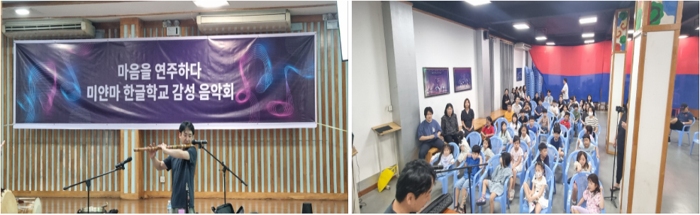 미얀마 한글학교는 토요일 하루만 운영되고 있으며 유치부부터 중학생부까지로 구성되어있다. 이곳에서는 한국 교육과정을 비롯해 여러 가지 프로그램을 준비하고 강사를 초빙해 교육을 진행하고 있다. 이번 달 눈에 띄는 프로그램은 두 가지로 추릴 수 있었다. 9월 27일에 진행된 <미얀마 한글학교 국악 체험 수업>은 학생 이외에 누구든지 참여가 가능했다. 양지석 강사님은 우리나라의 다양한 악기들을 현, 타, 관으로 나누어서 설명했다. 그리고 대금, 소금, 장구, 북, 태평소, 꽹과리 등을 하나씩 직접 연주하면서 어떤 소리가 나는지 아이들에게 들려줬다. 단순한 악기 청음이 아닌 섬세한 연주는 참여한 모두의 눈을 빛나게 만들었다. 또한 한국 전통 민요인 <진도 아리랑>을 아이들에게 가르치고 불러보는 시간을 가졌다. 강사님은 이들과 함께 “아리 아리랑 스리 스리랑 아라리가 났네”라는 가사를 반복해 부르며 쉽고 재밌는 교육을 진행했다.