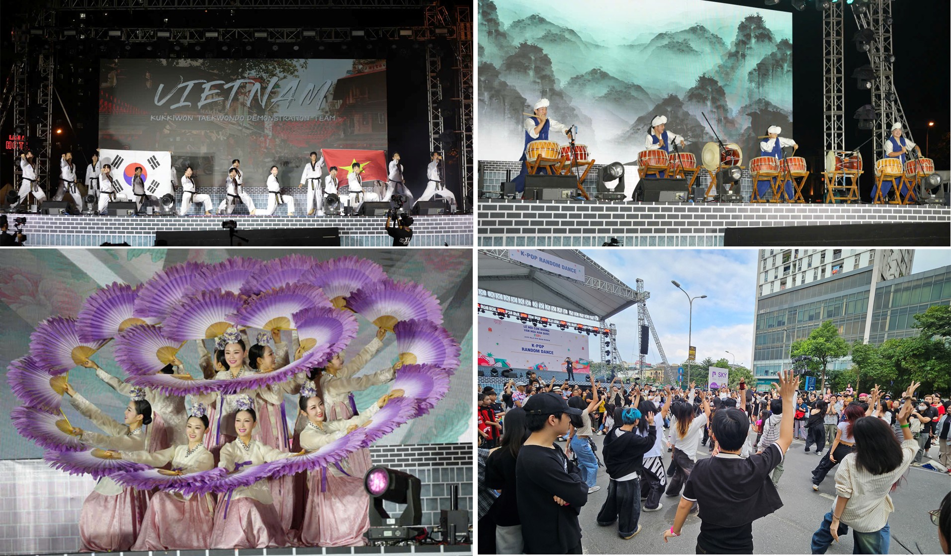 200여 명의 시민이 참여한 '한·베 전통 놀이 대회'에서는 단체 줄넘기와 '둥글게 둥글게' 등의 놀이가 이어졌고, 시민들이 직접 놀이에 참여하며 환한 웃음과 박수로 현장을 가득 채웠다. 축제의 하이라이트인 저녁 공연에서는 국기원 태권도 시범단의 역동적인 무대, 국립 국악원의 전통과 현대가 어우러진 국악 공연, 베트남 인기 가수 부이 꽁 남(Bui Cong Nam)과 황 쥬엔(Hoang Duyen)의 특별 무대, 케이팝 커버 댄스팀의 열정적인 퍼포먼스, 진주시 전통 공연단의 무대 등이 이어졌다. 한·베 양국 예술가들이 함께 꾸민 공연은 하노이 시민들에게 잊지 못할 가을밤의 감동을 선사했다.