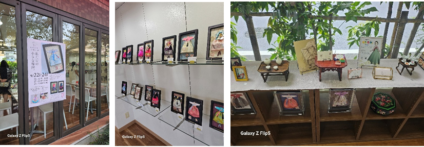 통신원의 방문 취재일에는 오픈과 맞물려 많은 관계자가 자리하고 있었는데, 15평 정도의 공간에 참가자와 관계자가 20명 정도 모여 있었고 실제 옷감과 재료를 사용해 작은 크기의 한복을 만든 뒤 액자에 넣은 작품을 전시하고 있었다. 마치 인형 옷과 같은 사이즈로 제작된 이 한복들은 디자인과 디테일적인 면에서 놀랍게도 실제 한복과 다른 점을 찾을 수 없었다. 또한 한복은 패션의 개념으로 입거나 실제 옷을 전시하는 개념이었지만 이번 전시에서는 작은 액자에 넣어 작품으로 전시함으로써 새로운 개념의, 마치 소품과 같은 인상을 줬다. 또한 전시장의 한 곳에 한복 만들기 체험 공간이 있었다. 이곳은 자연스럽게 만석이 됐다. 모두 관심 어린 표정으로 체험에 임하고 있는 점이 매우 흥미로웠다. 실제로 일본에서는 '한복'이라는 용어보다는 '치마저고리'라는 용어가 익숙하게 통용되고 있다. 또한 대장금과 같은 역사극이 인기를 끌면서 이 '치마저고리'에 대한 관심이 커진 결과이기도 하다.