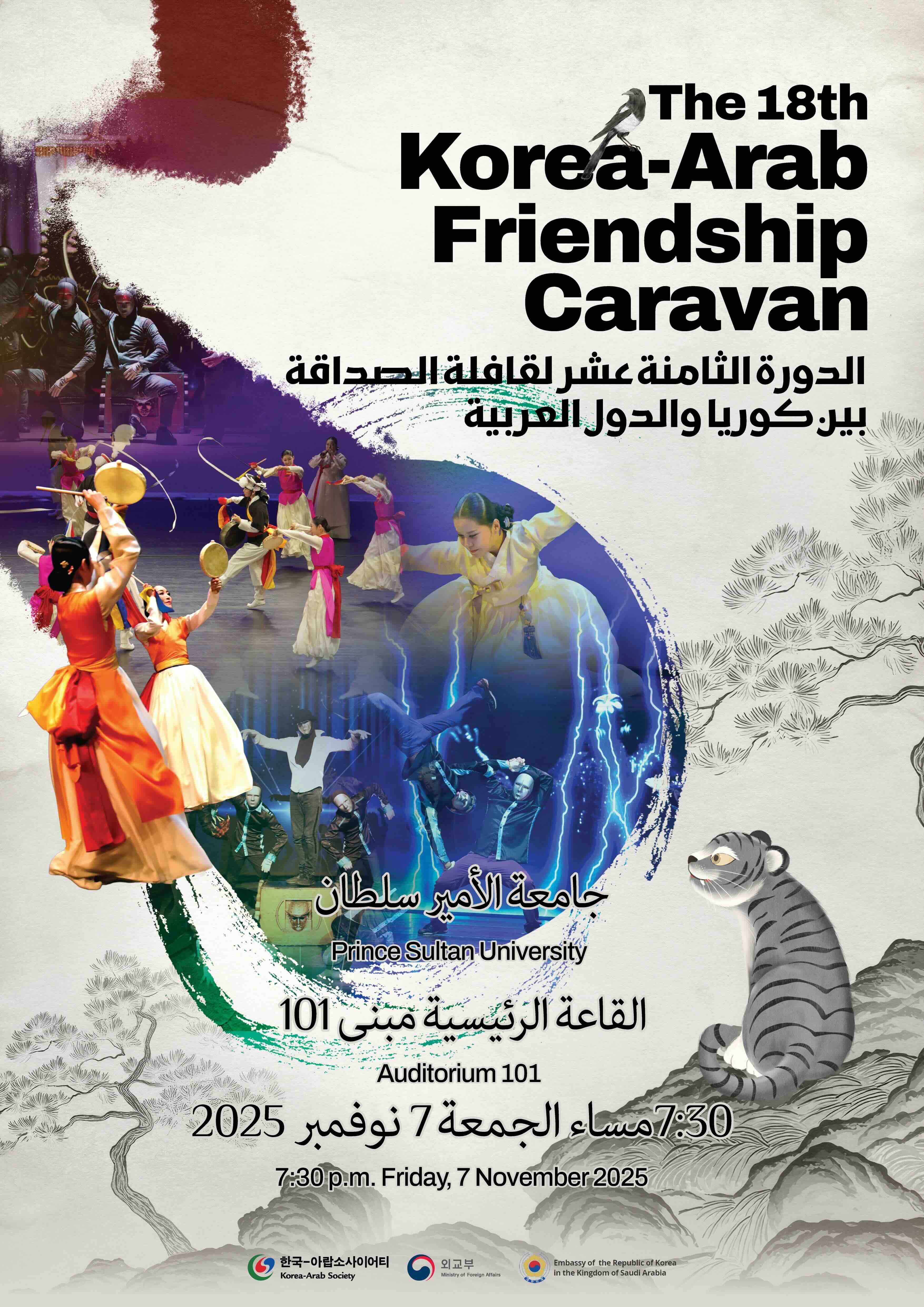 지난 11월 8일, 리야드 프린스 술탄 대학교(Prince Sultan University)에서 제18회 한국-아랍 프렌드십 카라반 공연이 개최됐다. 이 행사는 2008년부터 이어져 온 한국-아랍 소사이어티(Korea-Arab Society)의 대표 문화교류 프로그램으로, 매년 아랍권 주요 도시를 순회하며 한국의 전통·현대 공연예술을 소개해왔다. 올해 리야드 공연에는 판굿, 부채춤, 진도아리랑, 사물놀이 등 다양한 전통 공연과 더불어 익스프레션 크루(Expression Crew)의 비보잉 퍼포먼스가 함께 무대에 올랐다. 현지 매체 《아랍 뉴스(Arab News)》 역시 해당 공연을 보도하며 서로 다른 다섯 가지 공연이 각기 다른 한국 문화의 유산과 정체성을 보여주었다고 전했다. 행사 당일에는 해당 대학교에서 공연뿐만 아니라 리야드 세종학당에서 마련한 한국 문화 체험 프로그램도 함께 진행돼, 관람객들이 보다 다양한 방식으로 한국 문화를 경험할 수 있었다.