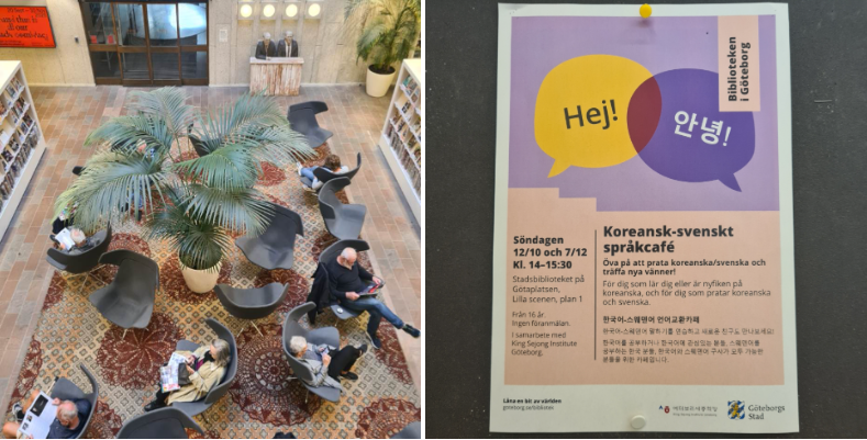 < (좌) 예테보리 도서관 내부, (우) 한국어-스웨덴어 언어 카페 안내 - 출처: 통신원 촬영 >