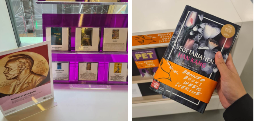 도서관 서가에서는 한국 대표 작가 한강의 작품도 쉽게 찾아볼 수 있었다. 노벨문학상 수상 도서 구역에서는 『작별하지 않는다』 스웨덴 번역본이 한강의 대표작으로 소개되었다. 또 ‘금지 도서 주간(Banned Books Week)’ 구역에도 한강의 『채식주의자』의 스웨덴 번역본이 진열되어 있었다. 예테보리 도서관은 해당 행사를 통해 도서 검열과 표현의 자유문제에 대한 사회적 논의를 활발하게 주도하고 있다. 금지 도서 주간은 자유로운 발언권을 지키고 모든 이가 책을 읽을 권리를 옹호한다는 취지에서 진행된다. 책은 생각과 가치를 전달하는 가장 강력한 수단이라는 점에서, 한 책이 금지되면 그 책이 담고 있는 사상과 관점 또한 검열된다. 도서관은 지식 전파의 최전선에 서 있지만 압력과 검열의 시도에서 항상 자유롭지 않다는 점도 이번 행사에서 강조되었다. 금지 도서 주간 기간 동안은 과거 혹은 현재에도 세계 어딘가에서 금지되었거나 검열 받은 문학 작품들을 조명하며, 독자들에게 표현의 자유를 지키는 것이 얼마나 중요한지 다시 한번 환기시켰다.