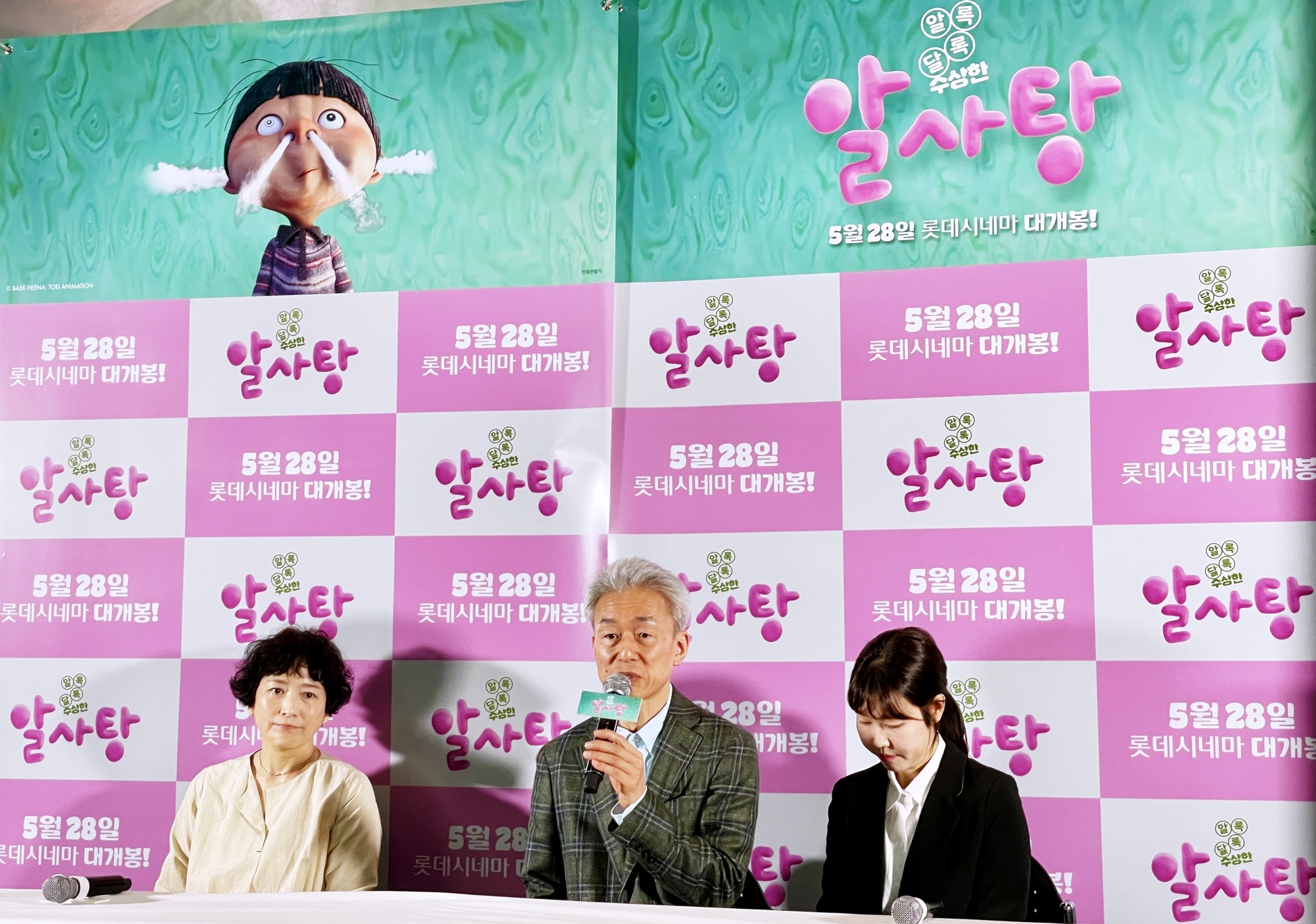 Продюсер «Волшебных конфет» Такаши Васио (в центре) 23 мая отвечает на вопросы журналистов на пресс-конференции в кинотеатре Lotte Cinema в Сеуле. 21-минутная короткометражка основана на детских книгах «Волшебные конфеты» (2017) и «Я собака» (2019) писательницы Пэк Хи Ны (слева). / Фото: Со Э Ён